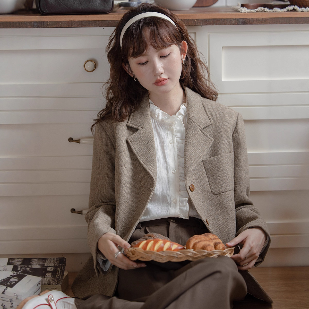 秋冬新款复古休闲毛呢西装外套女小个子宽松显瘦小西服